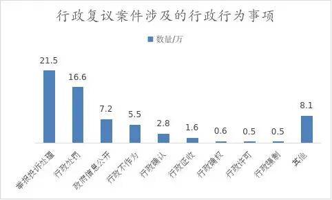 从行政行为事项上看,举报赞扬处置、行政惩罚、消息公开类案件数量较多,共占受理总量的69。8%。此中,举报赞扬处置和行政惩罚类案件数量同比别离上升33。0%和27。8%,消息公开案件数量则同比下降31。7%。前五位数量和占比别离是:举报赞扬处置21。5万件,占33。1%;行政惩罚16。6万件,占25。6%;消息公开7。2万件,占11。1%;行政5。5万件,占8。5%;行政确认2。8万件,占4。3%。