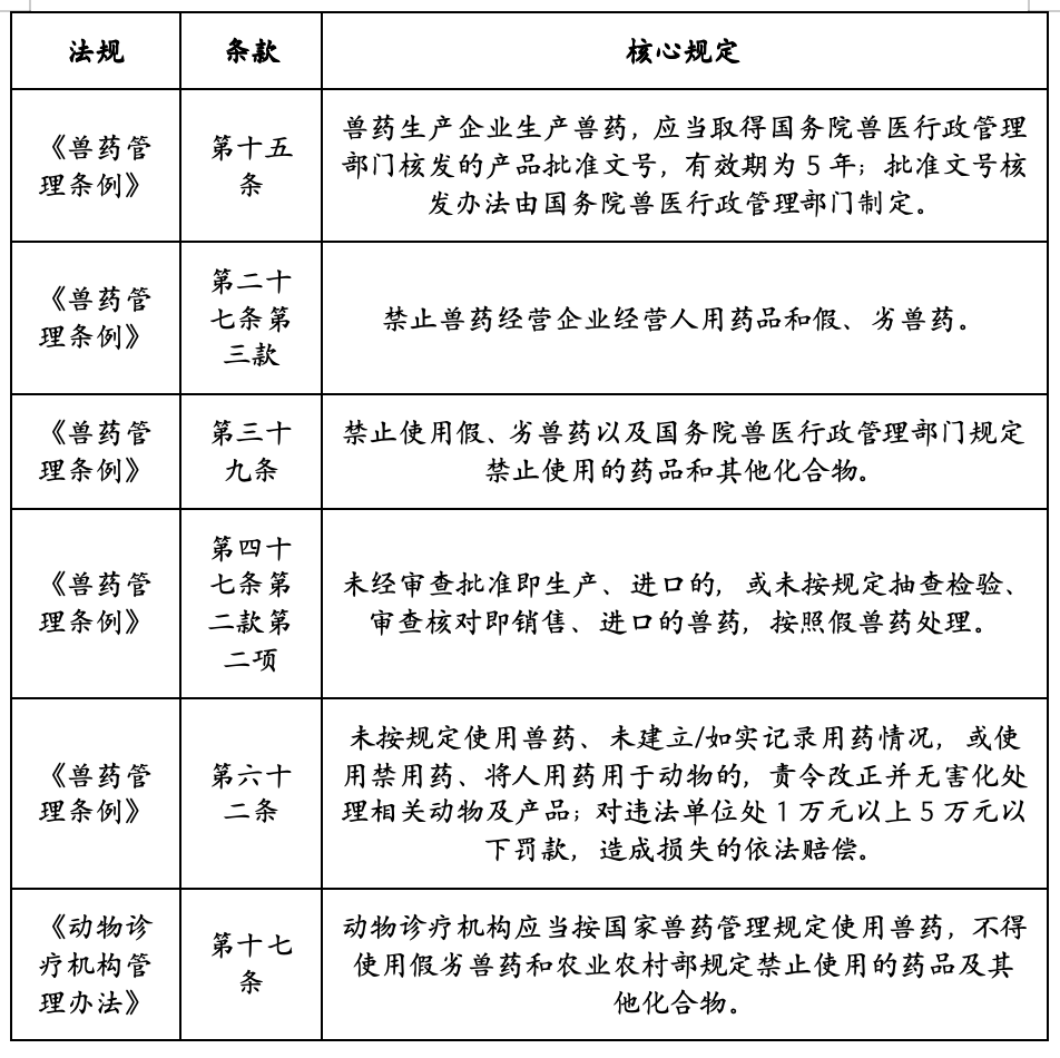 案例1!株洲市天元区麒行铁航商业商行(小我独资)案(株农(兽药)罚〔2025〕26号)中,株洲市农业农村局接12345市长热线日按照赞扬人举报,对该商行(兼营盛吉惠超市天元店)进行法律查抄,发觉其运营的犬藐小筛查用品(CPVAg)(2袋)和宠物蚤虫净(2瓶)两款产物,均未取得国务院兽医行政办理部分核发的兽药产物核准文号,同时该商行未打点《兽药运营许可证》。法律机关根据《兽药办理条例》第七十二条第一项、第十五条、第四十七条第二款第二项、第二十七条第三款、第二十二条、第五十六条第一款,连系《湖南省农业行政惩罚裁量权基准(兽药)》,认定该商行形成无兽药运营许可证运营该当经审查核准而未经审查核准即出产的兽药,做出归并行政惩罚:1。涉案犬藐小筛查用品(CPVAg)2袋、宠物蚤虫净2瓶;2。违法所得54元;3。对两项违法行为遍地货值金额2倍罚款,共计532。8元;罚没款合计586。8元。此案出格警示:即便是用于宠物疾病诊断的筛查用品、外用驱虫的中药制剂,只需属于《兽药办理条例》界定的兽药范围,就必需取得出产核准文号;新功能新用处不克不及成为规避审批法式的来由,无许可证+无核准文号的双沉违法,将面对归并惩罚。案例2:金**利用假兽药案(珠农农(动物)罚〔2020〕3号)中,珠海市农业农村局法律人员于2020年5月14日对金湾区壹零壹宠物诊所进行法律查抄,发觉该诊所配药房中药柜上存放有商品名为喘抗·麻杏石甘口服液的产物3盒,该产物标注有明白的医治结果,成分标注包含中成药,但未标注任何兽药出产核准文号,当事人金**也未能供给该产物的相关证件。经核查,当事人共进货10盒该产物,已正在诊疗勾当中利用2瓶,全数用于零星客户的宠物医治,相关客户未留存联系体例。法律机关根据《动物诊疗机构办理法子》第十七条、第三十四条,《兽药办理条例》第六十二条,以及《珠海市海洋农业和水务局及曲属行政法律单元行政惩罚裁量细化尺度》(农业畜牧兽医农产质量量部门)第十六条,认定当事人利用的喘抗·麻杏石甘口服液属于未经审查核准即出产的假兽药,形成违法利用兽药,责令其当即更正,并惩罚款1万元。此案明白:宠物中药口服液、合剂等中成药,取西药打针液、片剂一样,必需取得兽药出产核准文号,中药制剂的属性不改变其兽药监管素质,未取得核准文号的中药制剂,即便已现实用于诊疗,也属于假兽药。实务合规:农业农村部2023年印发的《农业农村部办公厅关于开展规范畜禽养殖用药专项整治步履的通知》(农办牧〔2023〕7号),明白将未经核准出产、运营中兽药列为沉点冲击对象,要求各地农业农村从管部分通过兽药二维码逃溯系统,全面核查中兽药产物来历,确保每一批中兽药均可逃溯至出产企业、可核查核准文号无效性,对未经核准出产、运营的中兽药,依法从严查处、,进一步压缩违法中兽药的空间。一是产物包拆能否清晰标注兽药产物核准文号:标示为“(兽药类别简称)X”,编制格局为:兽药类别简称+省份序号(2位数字)+企业序号(3位数字)+兽药品种编号(4位数字)。兽药类别简称有兽药生字、兽药字、兽药原字、兽药临字;二是出产企业能否取得《兽药出产许可证》,标示为“(20)兽药出产证字X号”,编制格局为:年号(4位数字)+兽药出产证字+编号(省份序号2位数字+企业序号3位数字),可登岸国度兽药根本数据库(,输入出产企业查询。正轨厂家能够查到出产许可证和GMP证的登记消息;三是通过产物能否纳入兽药二维码逃溯系统分辨。2016年,国度全面奉行兽药二维码标识防伪,通过扫描包拆上的兽药二维码,通过收集实现取地方数据库的毗连,实现兽药产物可逃溯,是一种无效的防伪手段扫描二维码。可扫码核查产物名称、规格、出产企业、出产日期等消息,确保来历、可溯。中兽医正在宠物诊疗用药环节,必需苦守合规、来历可溯的准绳,不克不及够“配方保密”“经验至上”为由,自行采购中药材配制膏剂、散剂,或委托第三方加工中药制剂自行配制或委托第三方加工高风险中药制剂(如膏剂、散剂、口服液等),此类行为均属于违法用药,即便是保守“经验方”“家传方”,用于贸易化宠物诊疗也需履行核准法式。