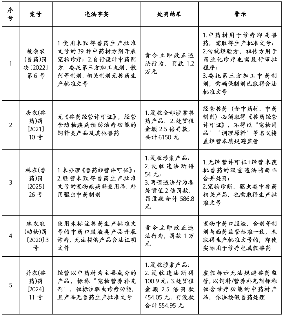 典型案例:杭州三千宠物病院无限公司案(杭余农(兽药)罚决〔2022〕第6号)中,该公司为凸起中兽医特色,自行设想中药配方(如参苓白术散、逐湿通窍散等),委托市的精彩堂()商贸无限公司代为加工制做成丸剂、散剂等中药成品,上述制剂均未取得国务院兽医行政办理部分核发的兽药出产核准文号,属于未经审查核准即出产的兽药,按假兽药处置。法律机关根据《兽药办理条例》第三十九条、第六十二条,连系《浙江省农业行政惩罚裁量基准(一)》,考虑到该公司系初度违法、情节轻细且共同法律,最终责令其当即更正违法行为,并惩罚款1。2万元。此案明白传送出监管立场:中兽医保守经验方家传方不克不及宽免兽药核准法式,即便是典范中药丹方,若用于贸易化宠物诊疗、未取得出产核准文号,无论其疗效若何,均属于违法用药;委托第三方加工中药制剂,也需确保制剂已取得核准文号,不然委托方取加工方均需承担法令义务。实务风险提醒:部门中兽医从业者存正在配方保密经验至上的认知,自行采购中药材、自行配制膏剂、散剂用于宠物诊疗,此类行为风险极高。需先向农业农村从管部分申请兽药出产核准文号,经审查及格后,委托具备《兽药出产许可证》的企业加工,严禁自行配制或委托无天分企业加工;同时,不得向宠物从发卖任何未取得核准文号的定制中药,避免触碰违法红线。虚假标示:中药材标饲料却含诊疗功能,依法按假兽药处置部门从业者为规避兽药监管、降低运营成本,采纳虚假标示的体例,将以中药材为次要成分的产物,标称饲料原料宠物养分弥补剂,但正在产物仿单、宣传案牍中,明白标注具有防止、医治、诊断宠物疾病的功能,此类行为属于典型的违法违规行为,该产物依法按假兽药处置,出产、运营、利用此类产物的从体,将面对财物、罚款等行政惩罚。-《农业农村部办公厅关于开展规范畜禽养殖用药专项整治步履的通知》(农办牧〔2023〕7号)明白要求:以中药材为次要成分、标示为饲料原料或饲料添加剂产物的,凡标注了防止、医治和诊断动物疾病的,依法按假兽药处置。-《兽药办理条例》第五十六条第一款:违反本条例,无兽药出产许可证、兽药运营许可证出产、运营兽药的,或者虽有兽药出产许可证、兽药运营许可证,出产、运营假、劣兽药的,或者兽药运营企业运营人用药品的,责令其遏制出产、运营,用于违法出产的原料、辅料、包拆材料及出产、运营的兽药和违法所得,并处违法出产、运营的兽药(包罗已出售的和未出售的兽药,下同)货值金额2倍以上5倍以下罚款;货值金额无法查证核实的,处10万元以上20万元以下罚款;无兽药出产许可证出产兽药,情节严沉的,其出产设备;出产、运营假、劣兽药,情节严沉的,吊销兽药出产许可证、兽药运营许可证;形成犯罪的,依法逃查刑事义务;给他人形成丧失的,依法承担补偿义务。出产、运营企业的次要担任人和间接担任的从管人员终身不得处置兽药的出产、运营勾当。太原老郭宠物病院办事无限公司案(并农(兽药)罚〔2024〕11号)中,太原市农业农村局于2025年2月21日对该公司进行法律查抄,发觉其运营的驱虫方糖宠物养分弥补剂产物,以中药材为次要成分,产物标称宠物养分弥补剂(饲料相关类别),但现实标注具有驱虫功能(属于动物疾病防止范围),该产物未取得兽药出产核准文号,属于以中药材为次要成分、标示为饲料添加剂产物,标注防止动物疾病功能的景象。法律机关根据《农业农村部办公厅关于开展规范畜禽养殖用药专项整治步履的通知》(农办牧〔2023〕7号)、《兽药办理条例》第四十七条第二款第二项、第五十六条第一款,认定该产物为假兽药,该公司形成运营假兽药,做出行政惩罚:1。驱虫方糖宠物养分弥补剂产物1盒零4粒(共16粒);2。违法所得100。9元;3。并处货值金额2。5倍罚款,计454。05元;以上罚没款合计554。95元。此案警示:虚假标示无律例避兽药监管,无论是宠物病院、宠物用品店,仍是中兽医工做室,均不得运营、利用此类挂羊头卖狗肉的产物,即便标称饲料养分弥补剂,只需涉及诊疗功能,就需按兽药办理,未取得相关天分的,将按假兽药查处。明白了中兽医执业的准入要乞降用药合规底线后,诊疗行为本身的规范实施同样环节。中兽医常见诊疗操做需恪守明白的法令鸿沟,杜绝违规操做,避免因行为不妥激发法令胶葛。中兽医常见的针灸、按摩、中药处方、体质调度等勾当,只需具有疾病指向性或医治目标,均属诊疗行为,需严酷满脚以下合规要求:病历取处方是诊疗勾当的焦点留存材料,也是胶葛措置、义务认定的环节根据,需严酷按照规范办理,确保完整可逃溯。按照《动物诊疗病历办理规范》,诊疗勾当需构成完整病历,包罗宠物根基消息、从诉、现病史、查抄成果、诊断看法、医治方案、用药记实、复诊环境等,由执业兽医签名确认。门(急)诊病历需正在就诊竣事后24小时内归档,住院病历需正在出院后3日内归档,保留刻日不得少于3年。电子病历需具备身份认证、逃溯功能,取纸质病历具有划一法令效力,不得、删除。兽医处方需利用规范格局,载明动物根基消息、诊断成果、兽药名称、规格、数量、用法用量、用药疗程、执业兽医签名等焦点内容(《兽医处方格局及使用规范》第)。处方开具当日无效,特殊环境可耽误至3日;不得开具虚假处方、空白处方,不得宠物从凭处方到其他具