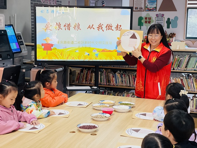 洛阳市涧西区沉庆街道二社区组织开展“爱惜粮食 从我做起”从题勾当。图为小伴侣们认实进修糊口中该当若何做到节粮爱粮。(洛阳市涧西区纪委监委供 宋娣 摄)!